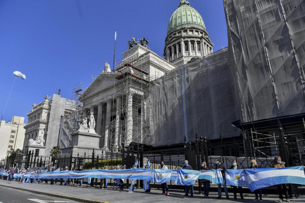 PROTESTAS EN EL CONGRESO. Por la tarde, cuando comenzó el debate, manifestantes antikirchneristas protestaron contra la reforma judicial. fotos telam