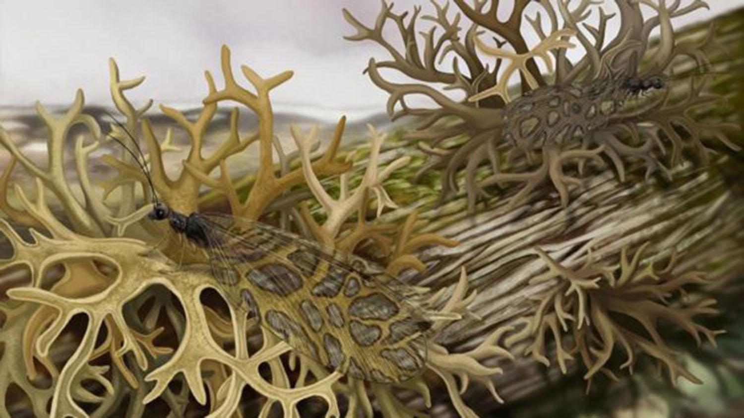 Una reconstrucción ecológica de una crisopa de 165 millones de años que imita un liquen que existió durante el mismo período de tiempo.