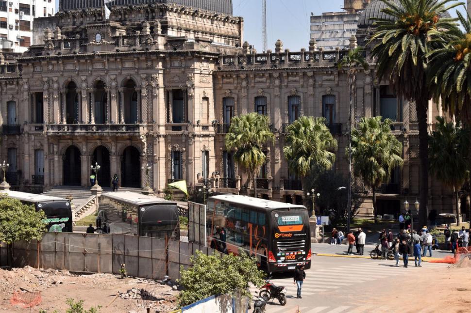 UNA PLAZA RODEADA. Con coches de larga distancia, referentes del sector turístico bloquearon los accesos a la Plaza Independencia para pedir una ley de emergencia.