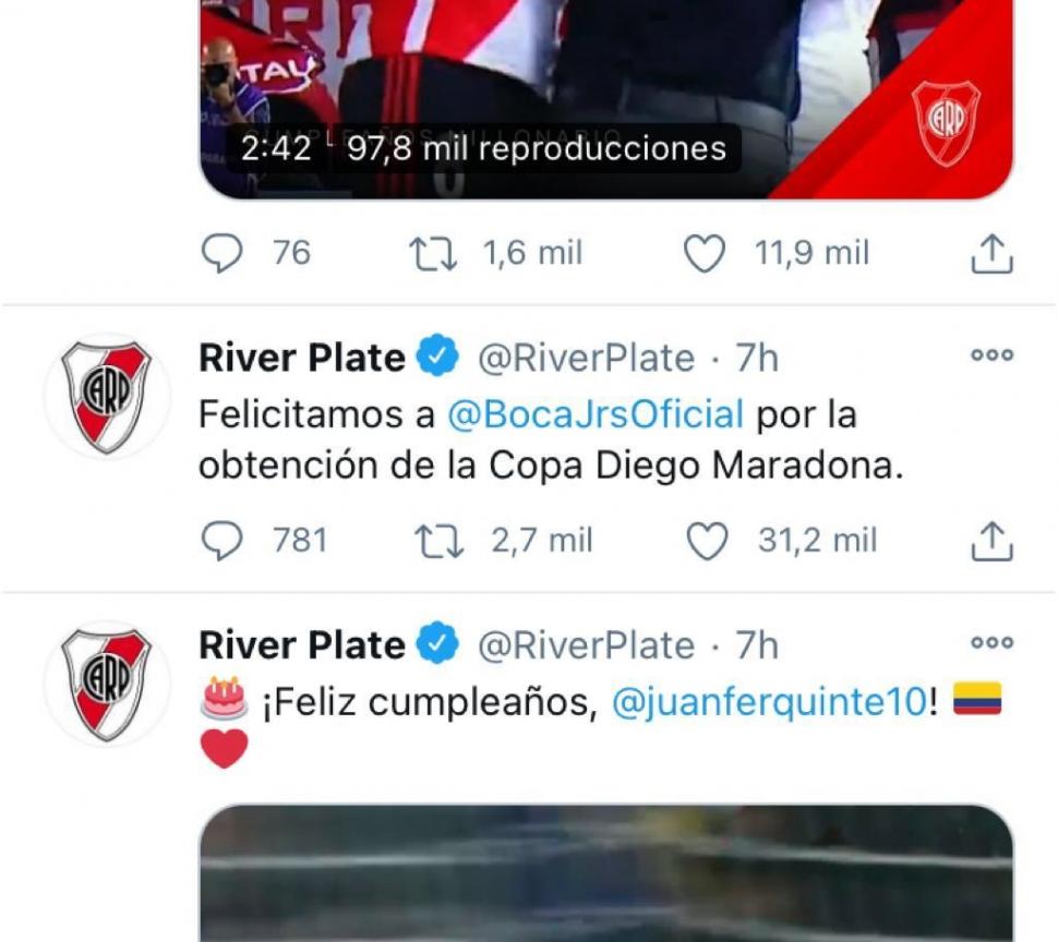 En la espera de la reunión entre Marcelo Gallardo y Rodolfo D’Onofrio para dejar en claro cual será el futuro del entrenador, River decidió felicitar a Boca. El “Millonario” dejó de lado las diferencias con su rival de toda la vida y le dedicó un mensaje desde su cuenta de Twitter. “Felicitamos a @BocaJrsOficial por la obtención de la Copa Diego Maradona”, dice la dedicatoria por el septuagésimo campeonato xeneize.