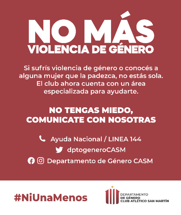 Mañana, en un acto que comenzará a las 15, quedará inaugurado un nuevo mural en La Ciudadela. Y no será uno más, sino uno contra la violencia de género. “No tengas miedo, comunicate con nosotras”, dice un comunicado emitido por el Departamento de Género de los “albirrojos”, que preside Carolina Peralta, y que fue creado el año pasado por la nueva comisión directiva. “El club ahora cuenta con un área especializada para ayudarte”, también reza el comunicado.