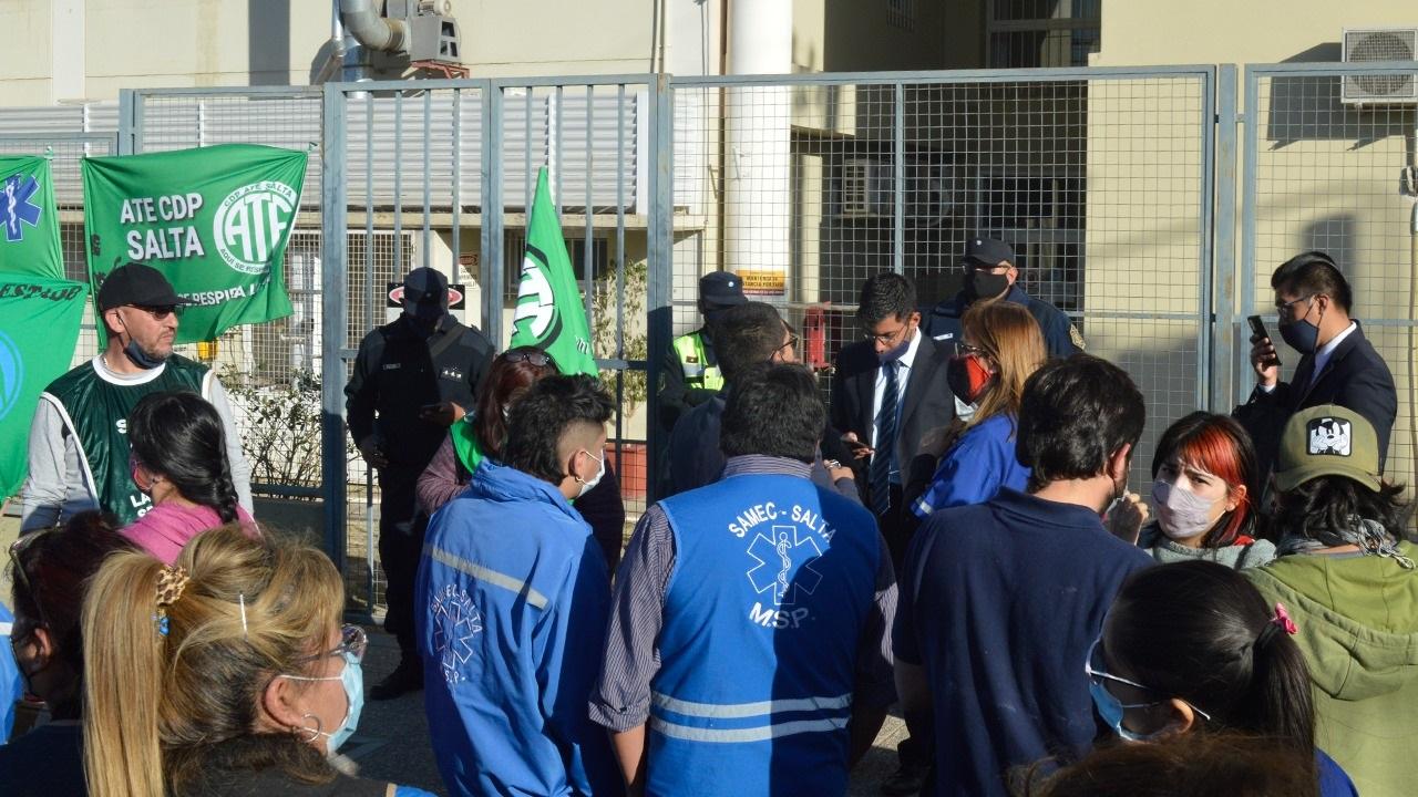 RUIDOSA MANIFESTACIÓN. Los empleados de Samec se congregaron en la Ciudad Judicial de Salta para exigir la liberación de sus compañeros.