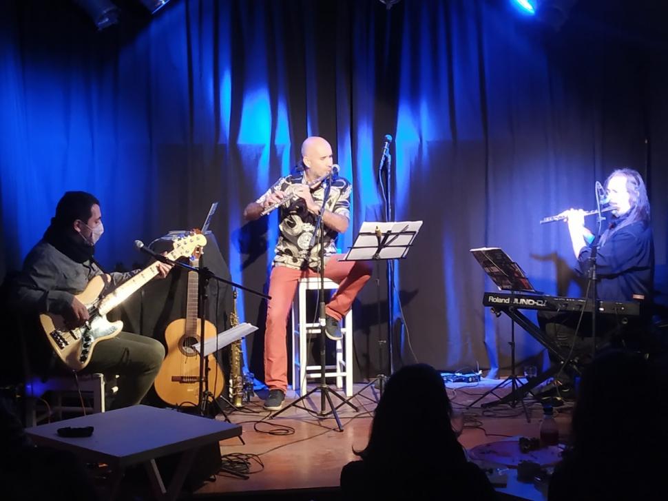 POR LOS CAMINOS DE LA MÚSICA. Villagra al bajo, Juan Martín Medina y Leopoldo Deza en flautas traversas en el show hecho el viernes en CiTá.
