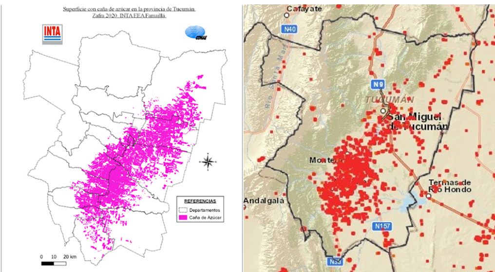Como sucede todos los años en agosto se agudizará la quema de cañaverales en pie y de rastrojo. En el mes de julio de 2021 aparecieron más focos de quema que en junio del mismo año. Una comparación de imágenes demuestra palmariamente cómo los focos de fuego coinciden con la superficie implantada de caña. La fotografía de la superficie con caña de azúcar cultivada en Tucumán (2020) y la imagen satelital para los focos de fuego durante julio de 2021 (adjuntas) no dejan duda sobre dónde se registran los fuegos que están generando los contaminantes atmosféricos que afectan a todo Tucumán.