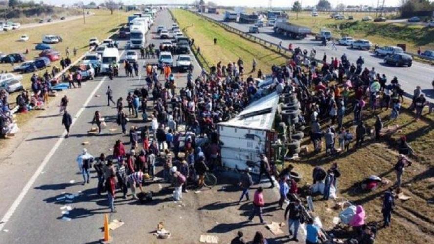 BUENOS AIRES.- En la madrugada, un camión que transportaba alimentos volcó en la Panamericana, a la altura de la localidad de Campana. Fue en el kilómetro 81, en dirección al norte. El accidente no implicó muertes ni heridos, pero fue noticia por lo que pasó poco después: una multitud de vecinos se agolparon alrededor del vehículo y se llevaron todo lo que transportaba.