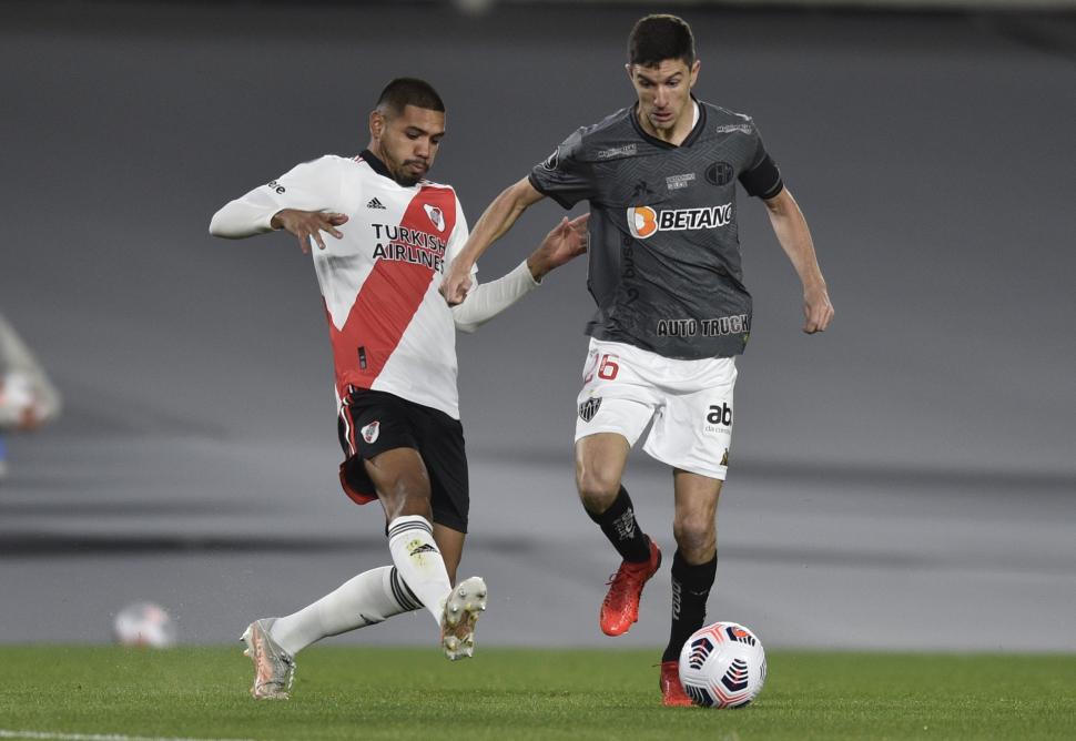 EL HOMBRE DE LA NOCHE. Ignacio Fernández se lleva la pelota pese a la marca. El ex River hizo el gol de Atlético Mineiro, y luego fue expulsado. REUTERS
