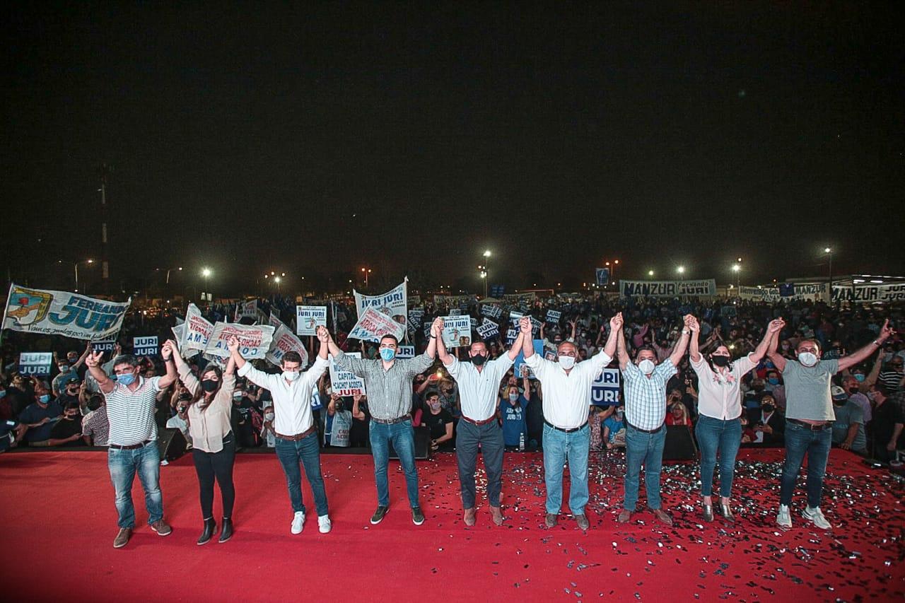 Ante los miles de asistentes, Manzur exclamó: “Este es el peronismo, que siempre está a la par mía. Gracias por esta demostración de afecto, de cariño y de compromiso. La estructura de Fernando Juri y Juri Debo está intacta y más fuerte que nunca. Hoy es una tarde distinta, de alegría y entusiasmo. ¡Si esto no es el peronismo, el peronismo donde está!”.