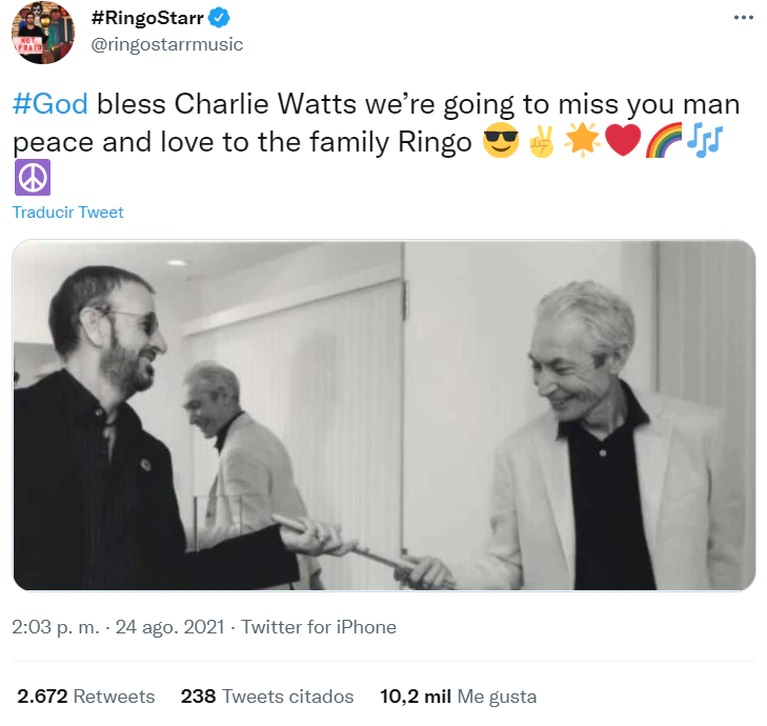 “Dios te bendiga Charly Watts. Vamos a extrañarte. Paz y amor a la familia”, escribió en su cuenta de Twitter el exbaterista de The Beatles, Ringo Starr, junto a una foto de ambos en blanco y negro.