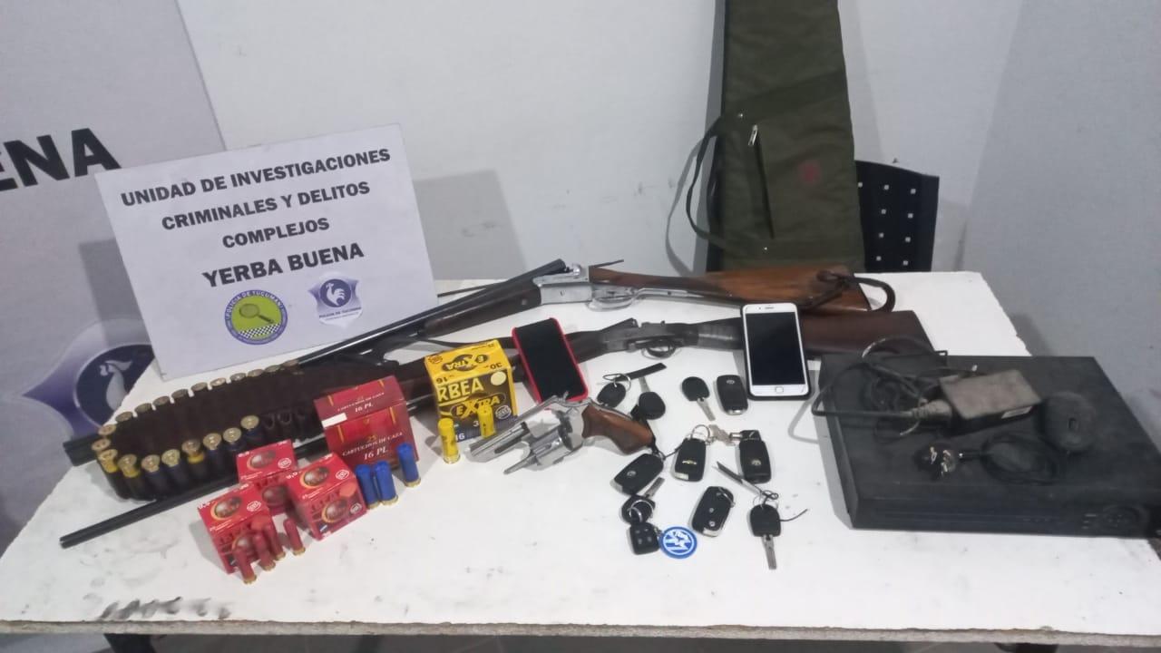 En el marco de una investigación por estafas millonarias, policías de la Unidad de Investigaciones Criminales y Delitos Complejos de Yerba Buena concretaron dos allanamientos en esa ciudad, y secuestraron armas, teléfonos celulares y 10 llaves de vehículos, entre otras evidencias.