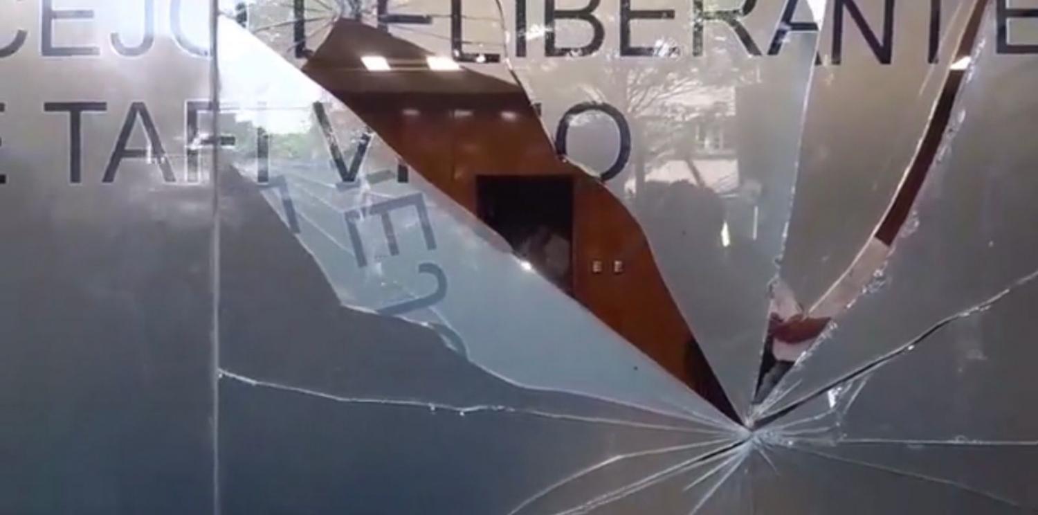 Una de las piedras rompió el panel de vidrio del Concejo Deliberante.