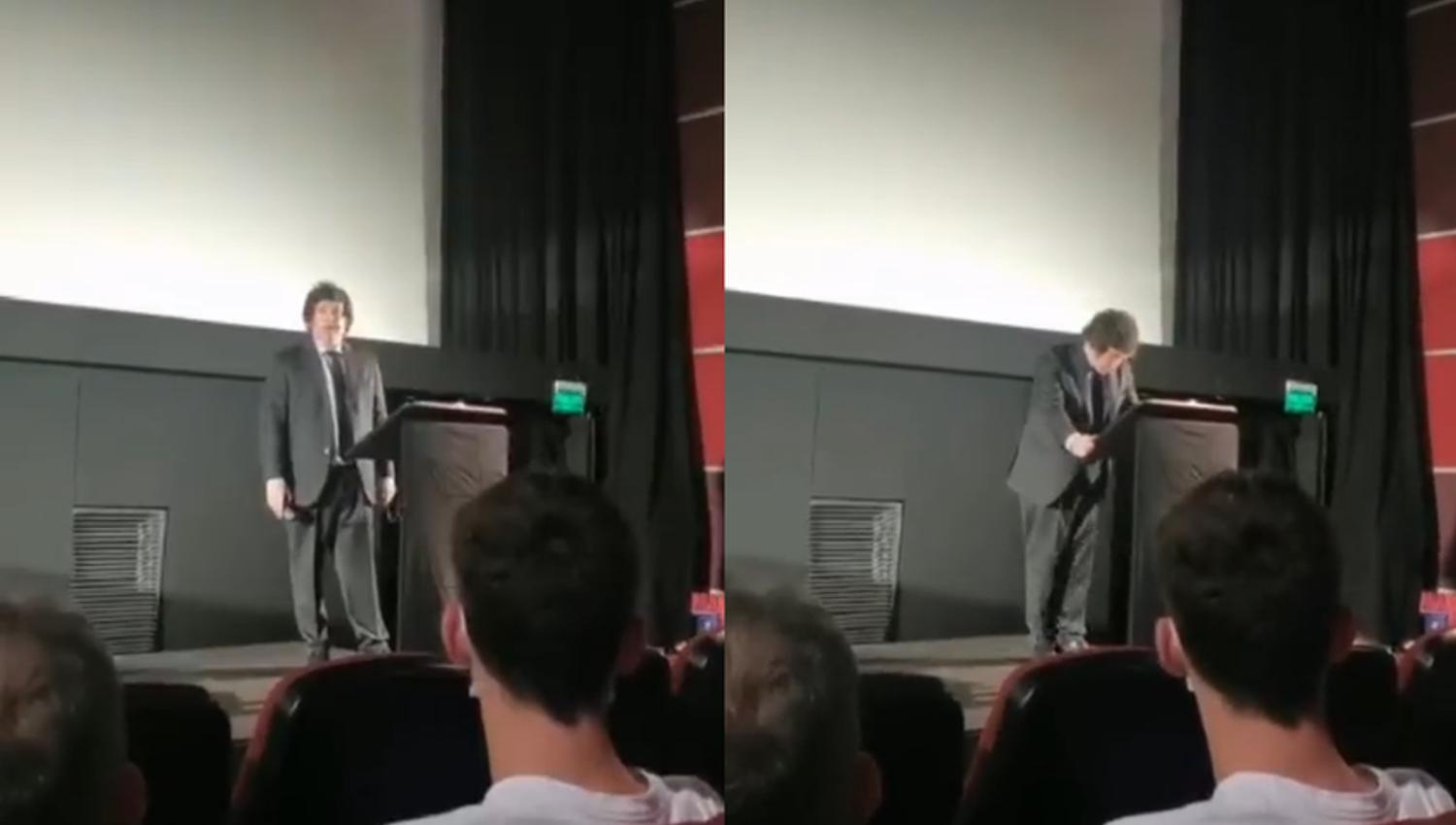 El referente de La Libertad Avanza interrumpió la charla que estaba dando en el auditorio Sala Movie Center del Montevideo Shopping y exigió al público silencio.