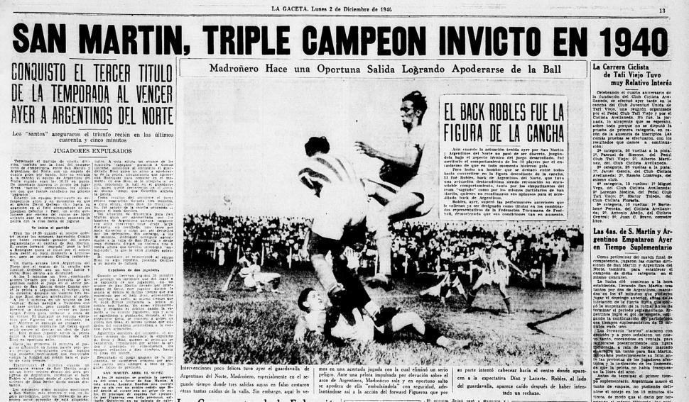 “Desde 1919 hasta ahora, han pasado 22 años, pero nunca ninguna institución, logró la satisfacción que desde ayer constituye un motivo de inmensa satisfacción para los dirigentes, asociados, jugadores y simpatizantes del viejo club que hace pocos días cumpliera 31 años de vida activa en el deporte tucumano” de esta manera se anunciaba el logro del club San Martín de ceñirse la triple corona de 1940 al ganar invicto los torneos Anual, Honor y Competencia, este último el primero de diciembre de aquel año al derrotar 4 a 2 a Argentino del Norte.