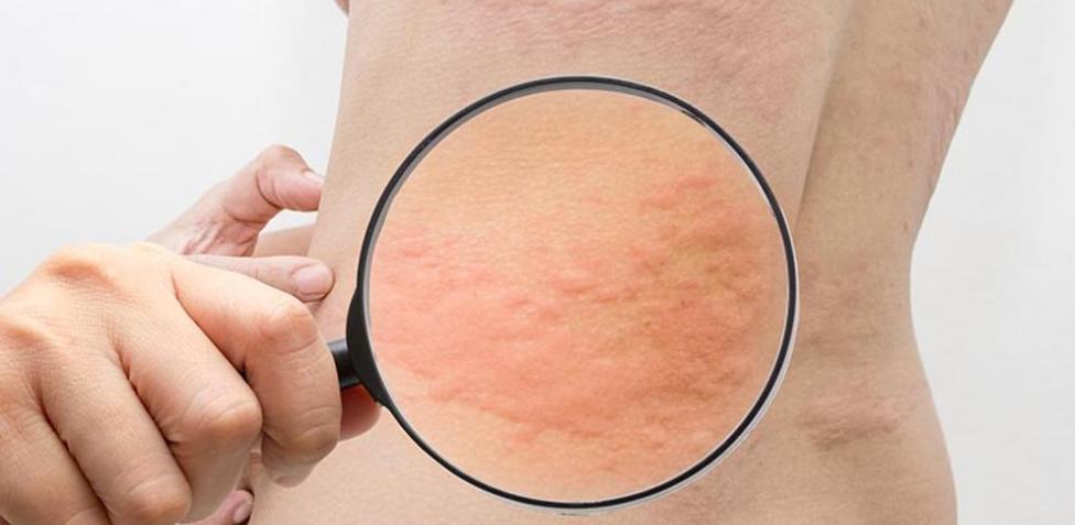 • Urticaria o dermatitis que afecta a la piel. Se trata de ronchas rojizas, elevadas y que suelen picar. Aparecen en la superficie de la piel como reacción alérgica a ciertos alimentos y medicamentos o por el contacto con sustancias alergénicas, la exposición extrema al frío o al sol, entre otras causas.
