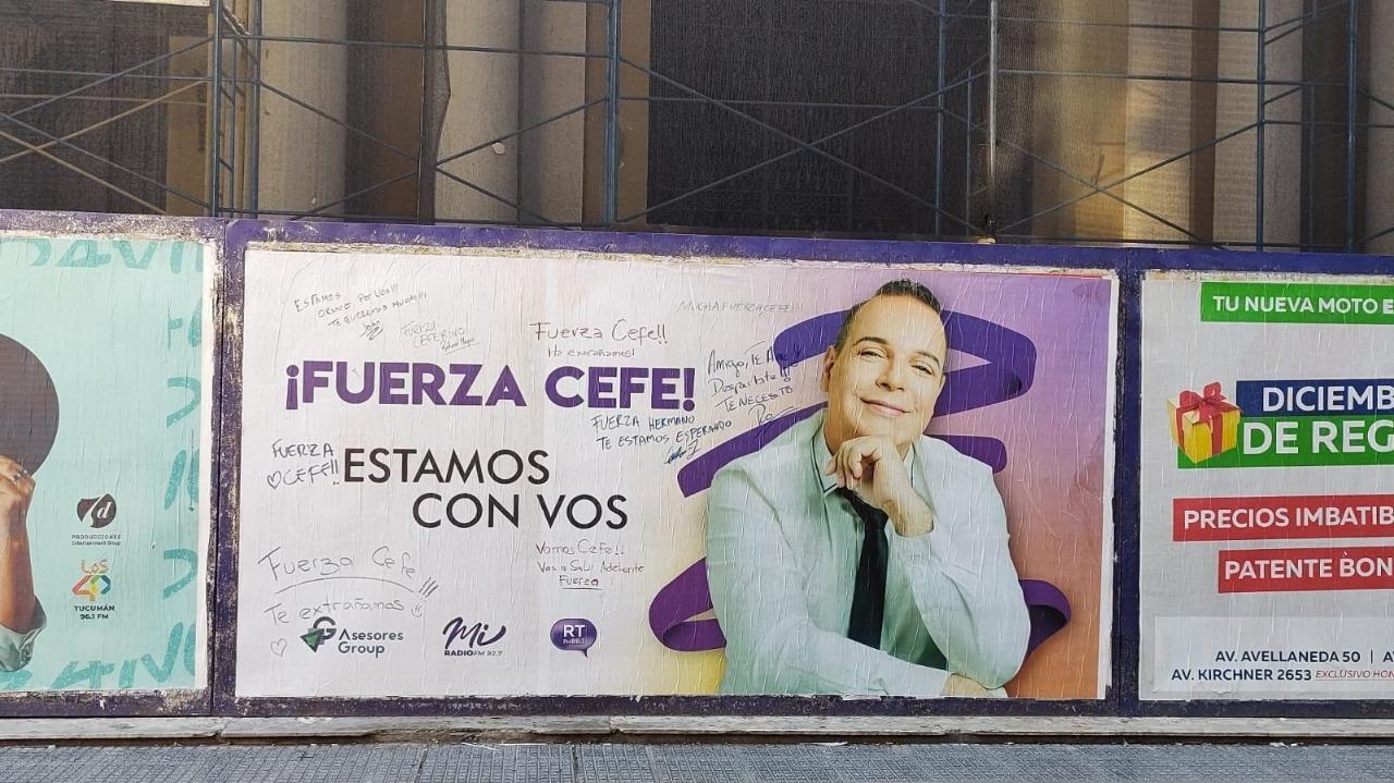 “Fuerza Cefe, estamos con vos”, se lee en el centro de un cartel de la vía pública, en el que su audiencia aprovechó para escribir sus propios mensajes.