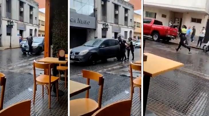 Fue entonces cuando la guardia del sanatorio dio aviso a la Policía y se produjo el cruce captado en el video. Pero la historia no terminó ahí: el presunto agresor aceleró y huyó por 9 de Julio, pese a que la mujer policía hizo un disparo para intentar disuadirlo. Los uniformados lo siguieron a pie, pero este dobló por General Paz a excesiva velocidad.