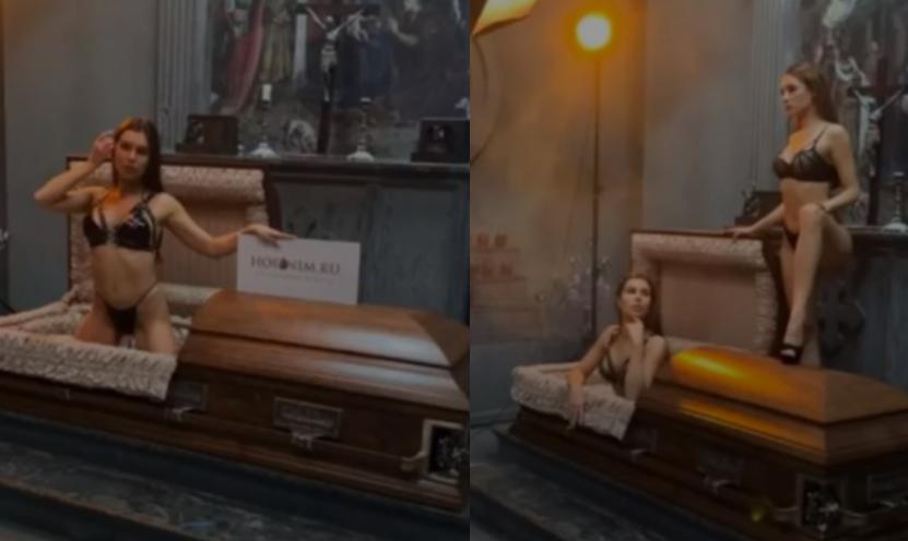 El video fue publicado en Instagram y muestra a dos mujeres posando sensualmente semidesnudas y entre los ataúdes. Las imágenes son acompañadas por el mensaje: “Contamos con nuestro propio personal de agentes calificados que controlan la organización del funeral en cada etapa, desde el papeleo hasta el ritual funerario”.