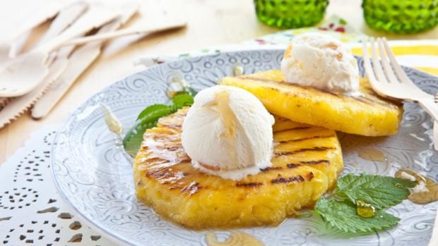 Poner en una sartén 1 cucharadita de manteca y saltear allí durante unos minutos dos tazas de trozos medianos de ananá; moverlos continuamente para que se doren por todos lados (añadir un par de cucharadas de agua si ves se pega). Agregar 3 cucharadas de azúcar moreno y dejar que se mezcle y seguir a fuego suave unos 10 minutos. Retirar y añadir 4 hojas de albahaca fresca picada; dejar que se enfríe (incluso se puede preparar con antelación y guardar en la heladera). Para servir, tomar una plancha de masa filo, cortar tiras largas de unos 4 cm de ancho, y plegar cada una como un acordeón rectangular (hacer tantos como comensales haya). Aplastarlos un poco y hornear a 200ºC; apenas empiezan a dorarse están listos. Dejar enfriar y montar el postre: un par de cucharadas del ananá, un crujiente de masa filo y, encima, helado de crema americana. Por último, una hoja de albahaca para decorar.