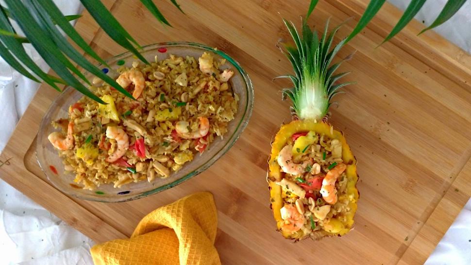El día anterior cocinar (y refrigerar) 3 tazas de arroz jazmín. Para la preparación (que dará para dos o tres porciones), sofreír en un wok o una sartén grande 1 cebolla pequeña finamente picada. Cuando esté lista, freír allí, de ambos lados, 10 langostinos; sacarlos del wok y reservar. Echar entonces 2 huevos, revolverlos, y agregar 1 cucharadita de polvo de curry, 1 pizca de coriandro molido, 1 cucharadita de azúcar, 1 cucharada de salsa de soja y 1 tomate mediano. Cortar longitudinalmente un ananá (con hojas y todo), ahuecar la cáscara de la mitad sin romperla (se usará para servir), picar la pulpa “esquivando” los centros duros y sumarla a la preparación. Por último, añadir el arroz, mezclar para integrar bien, y sazonar con sal y pimienta a gusto. Rellenar la cáscara con la mezcla, colocar sobre ella los langostinos, y acompañar con cebolla de verdeo picada y castañas de cajú.