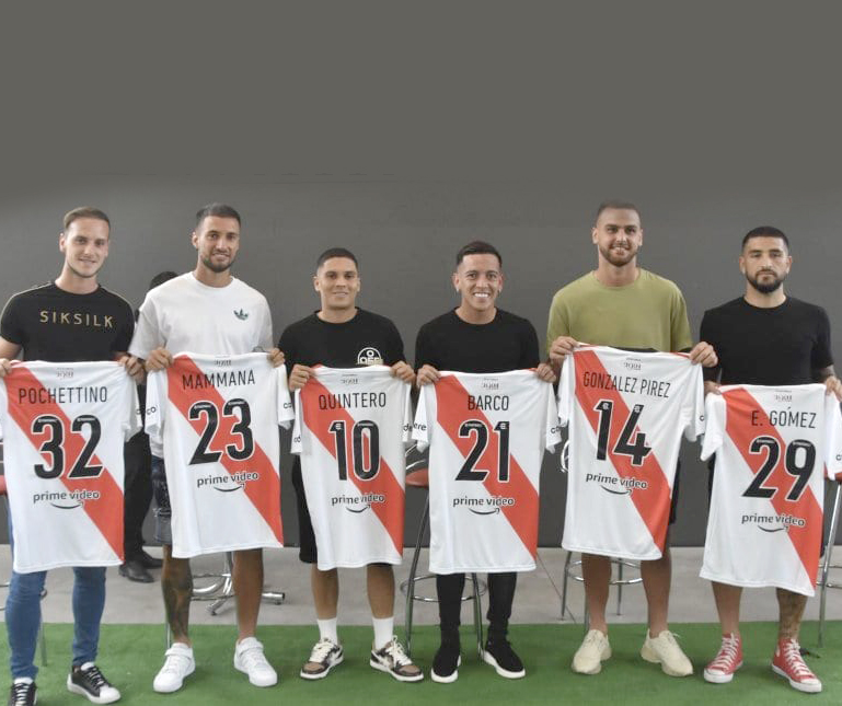 El “Millonario” hizo gala de su mote y apostó fuerte en el último mercado de pases, para dejar conforme a Marcelo Gallardo. Ayer por la tarde, en el Monumental, presentó a seis de sus siete resonantes refuerzos: Tomás Pochettino, Emanuel Mammana, Juan Fernando Quintero, Esequiel Barco, Leandro González Pírez y Elías Gómez. Andrés Herrera no pudo estar en la foto porque se demoró más de lo esperado en la revisión médica.