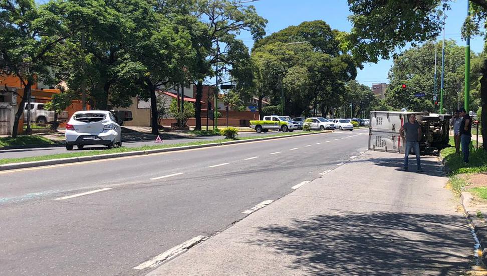 El golpe ocasionó, por un lado, el vuelco del vehículo de mayor porte, pero también hizo que el auto salte la platabanda y quede detenido sobre la acera que va hacia el cerro.