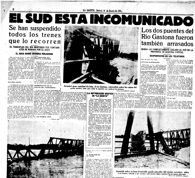El vespertino también tuvo palabras de preocupación por otros puentes del sur al expresar que “lo que sucedió en el puente del Gastona no está distante de suceder en el provisorio sobre el cauce del Graneros y algunos de los otros de hierro que se encuentran en el mismo pésimo estado”.