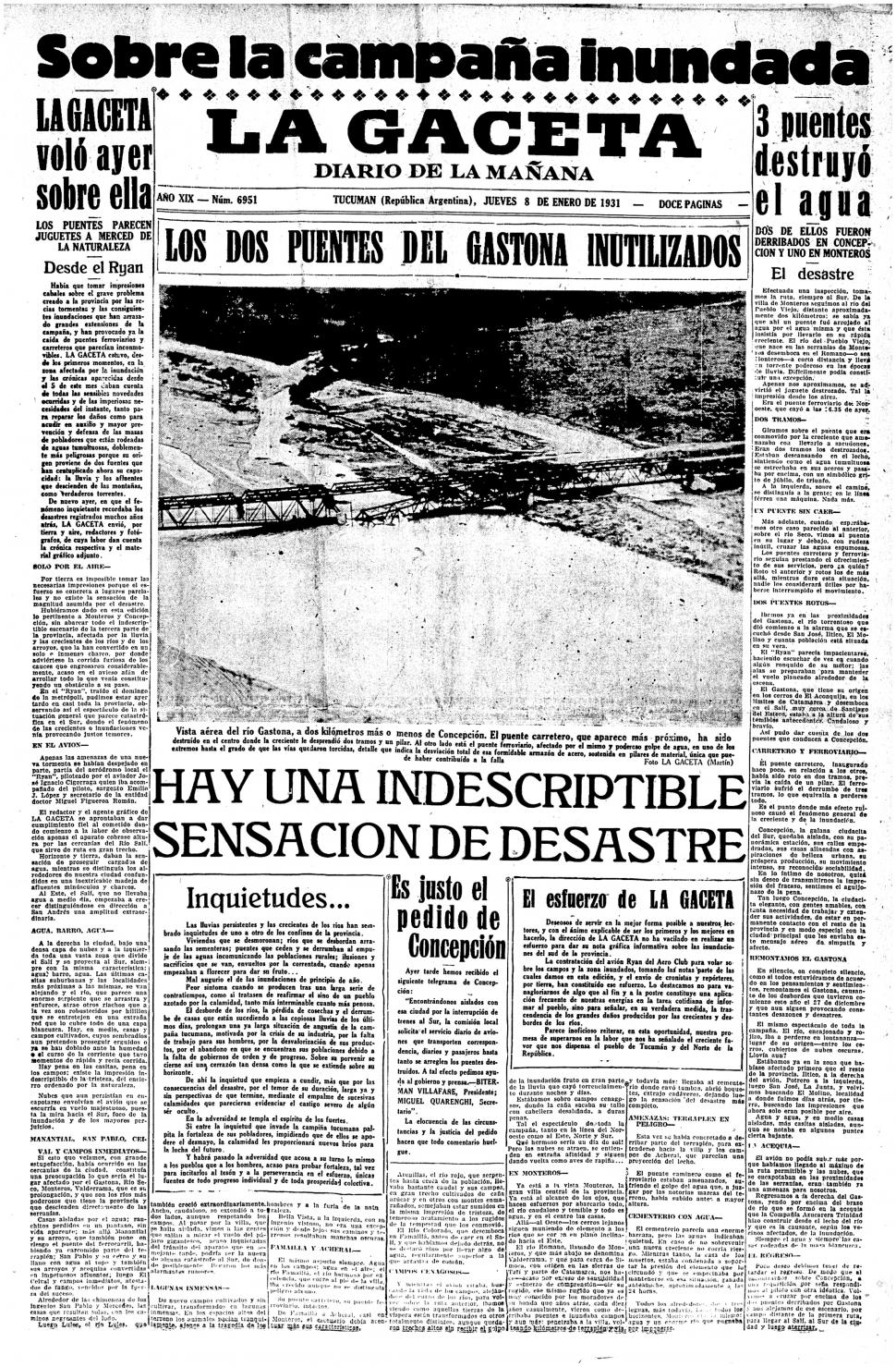 La tapa del 8 de enero de 1931 es un fiel compendio de los destrozos causados por la feroz tormenta del día previo a la llegadas de los Reyes Magos; y que durante las jornadas siguiente mantuvo a Tucumán en alerta. El sur estaba incomunicado por la caída de los puentes (carretero y ferroviario) sobre el río Gastona, reflejado fielmente con la foto aérea lograda desde el flamante avión Ryan adquirido por el Aero Club unos días antes. En la nota titulada “LA GACETA voló ayer sobre ella”, en referencia al gran título superior “Sobre la campaña inundada”, la crónica reconocía, para la cobertura de catástrofes, la importancia del avión como herramienta de apoyo para el fotógrafo. En la nota editorial titulada “Hay una indescriptible sensación de desastre” también se hacía hincapié en la inquietud que el pueblo tenía ante la magnitud de los destrozos. Varios equipos periodísticos recorrieron la provincia, tanto por tierra como por aire, para llevar toda la información a los hogares tucumanos.