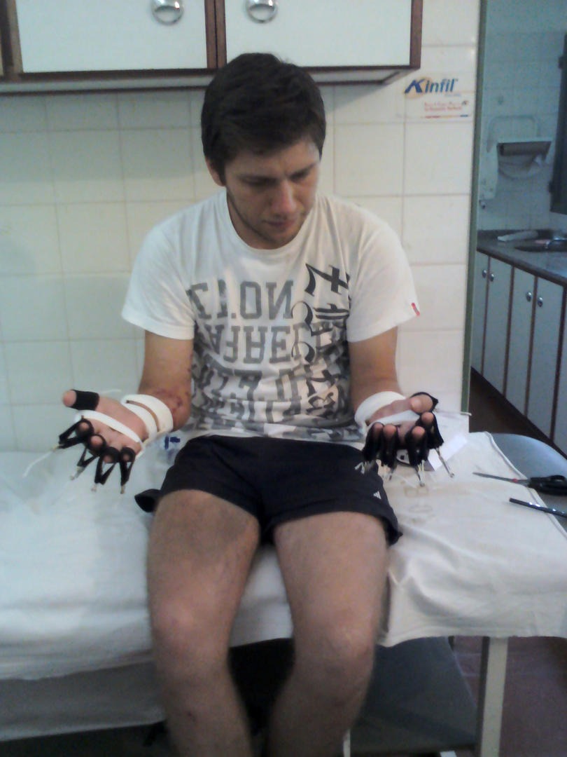 - Sí, juego al fútbol; no con frecuencia porque trabajo mucho. También voy a la pileta. Al principio, cuando no tenía sensibilidad, estaba en rehabilitación y movía los brazos; sentía hasta hasta arriba del antebrazo; lo veía pero no lo sentía. Cuando nadaba, en el afán de sentir, nadaba, me cruzaba para la derecha. Entonces concentraba en el hombro lo que sentía, y con la sensibilidad de esta parte me podía guiar para ir derecho; si no, me cruzaba.