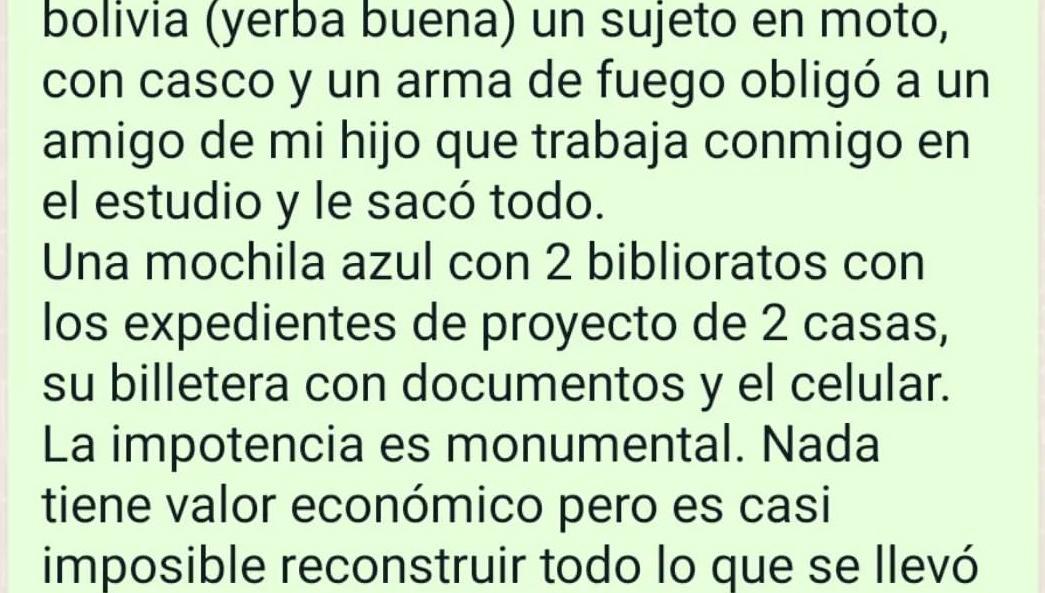 “Hoy me toca a mí ser víctima de la inseguridad. A las 9.40, en Chile casi Bolivia (Yerba Buena), un sujeto en moto, con casco y arma de fuego (asaltó) a un amigo de mi hijo que trabaja conmigo en el estudio. Le sacó todo: una mochila azul con dos biblioratos, con los expedientes de proyectos de dos casas, su billetera con documentos y el celular. La impotencia es monumental: nada tiene valor, pero es casi imposible reconstruir todo lo que se llevó ese impune ser”, posteó Molineri en sus redes sociales.