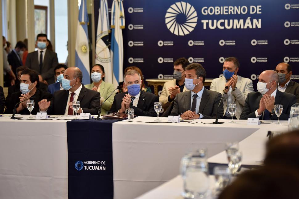 PROTAGONISTAS. Juan Manzur, Osvaldo Jaldo y Sergio Massa. LA GACETA / FOTO DE INÉS QUINTEROS ORIO