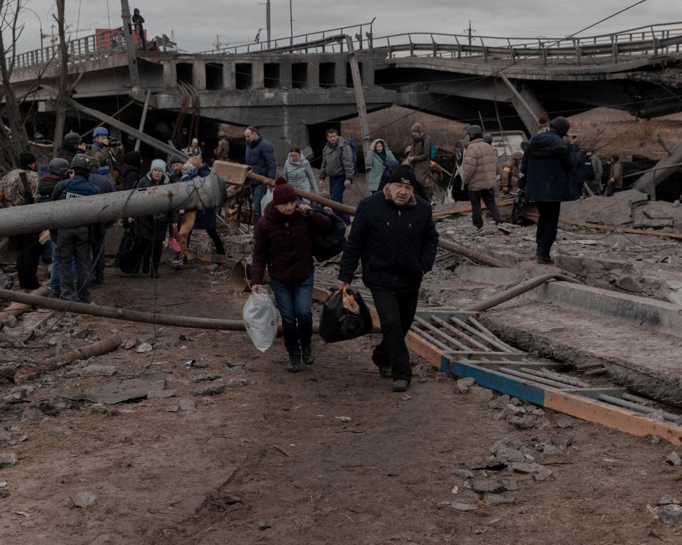 EL ÉXODO. La gente cruza un puente destruido mientras intenta salir de la ciudad de Irpin, cerca de Kiev. reuters