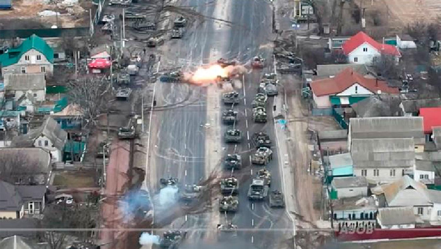 EN LLAMAS. Un grupo de tanques es atacado en las afueras de Brovary, en el Óblast de Kiev. REUTERS