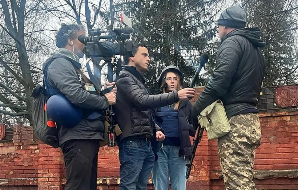 La periodista de Fox News Oleksandra "Sasha" Kuvshynova, que murió en Ucrania después de que el vehículo en el que viajaba fuera alcanzado por un fuego enemigo, trabaja con sus colegas Trey Yingst y el camarógrafo Pierre Zakkrzewski en Ucrania en una fotografía sin fecha. FOX News/vía REUTERS