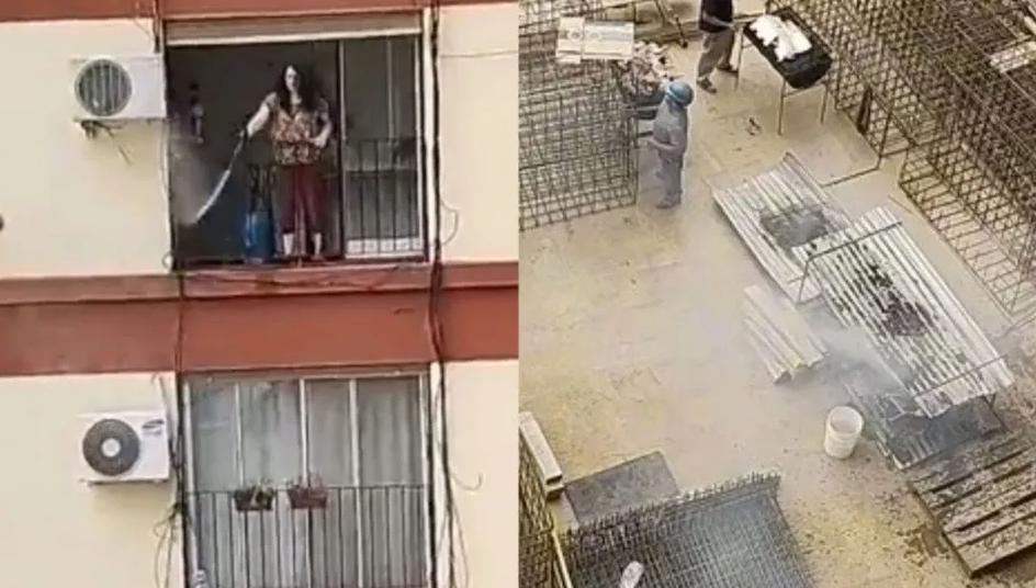 La mujer salió al balcón con una hidro lavadora y arrojó agua al asado de los trabajadores. La conducta de la intolerante vecina fue filmada por un joven que desde el edificio del frente pudo ver la escena. Sorprendidos por lo que sucedía, los albañiles le gritaron que pare y se quedaron mirándola. Por lo que se ve en las imágenes, el agua no llegó hasta la parrilla. ¿Habrán podido comer su tan esperado asado?