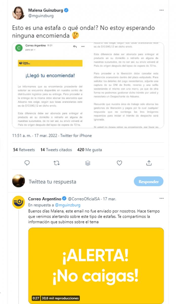 El tuit de Ginzburg tuvo más de 200 respuestas de usuarios contando su experiencia sobre emails tratando de estafarlos. Una de las usuarias de la red contestó: "Cada mes, más o menos, recibo el mismo mail! Les contesto bardeándolos y elimino y vuelven a mandar!". Otro usuario le comentó: "No es tu caso, pero si fuera que esperas algo de afuera y hay que pagar alguna tasa, es a través de la página del correo donde generas el VEP para abonar. Nunca te mandan este tipo de correos".
