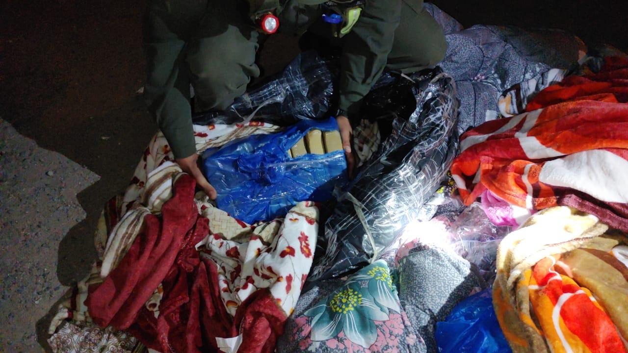 Al abrirlos ante testigos, observan envuelto en una manta 8 paquetes de cocaína. Por las inscripciones de los bultos se pudo identificar al propietario.