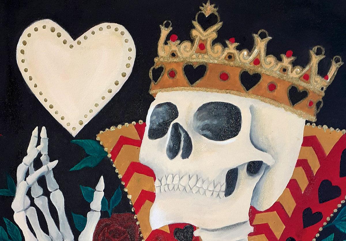 “Es una reflexión sobre la vida, la muerte y la continua relación entre las dos. Tomo la muerte no como algo final sino como una transformación, eligiendo colores intensos y la insistencia de distintas calaveras para resaltar la belleza y complejidad de ambos conceptos«, agrega.