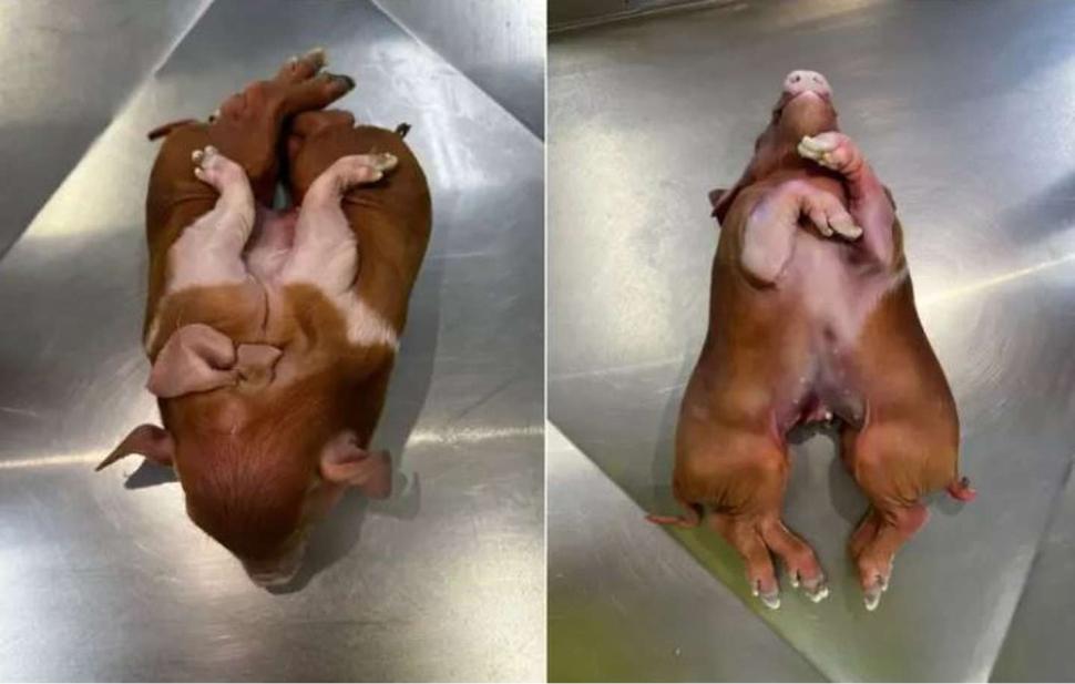 El extraño animal presenta malformaciones en todo su cuerpo y tiene una cabeza, cuatro patas delanteras, cuatro traseras y lo que parece una segunda cabeza incipientemente desarrollada.