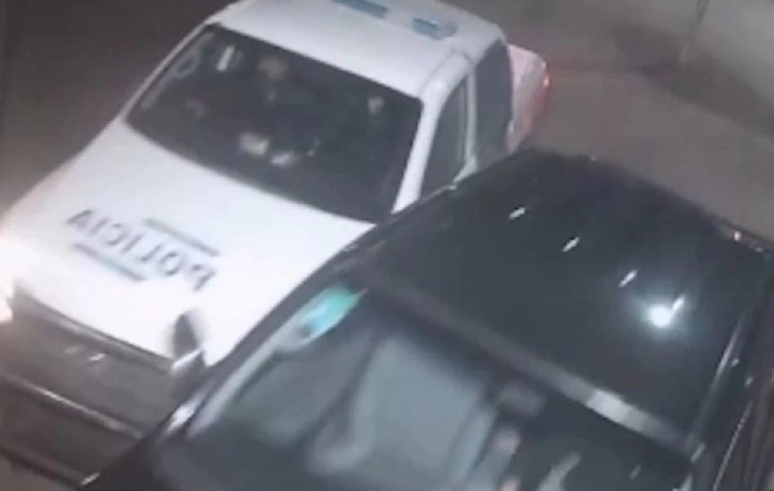 En un video de cámaras de seguridad de los vecinos se ve la secuencia en que una Toyota Hilux negra con los vidrios polarizados frenó frente al portón de entrada al barrio y un patrullero sin la sirena encendida lo chocó del lado del acompañante. Ante esta situación, la camioneta dio marcha atrás y abandonó el lugar por la ruta, mientras que el patrullero quedó detenido allí.