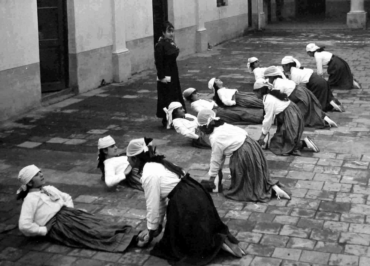 EDUCACIÓN. Alumnas de la Escuela Sarmiento ensayan en el patio. Una imagen de mediados del siglo XX.