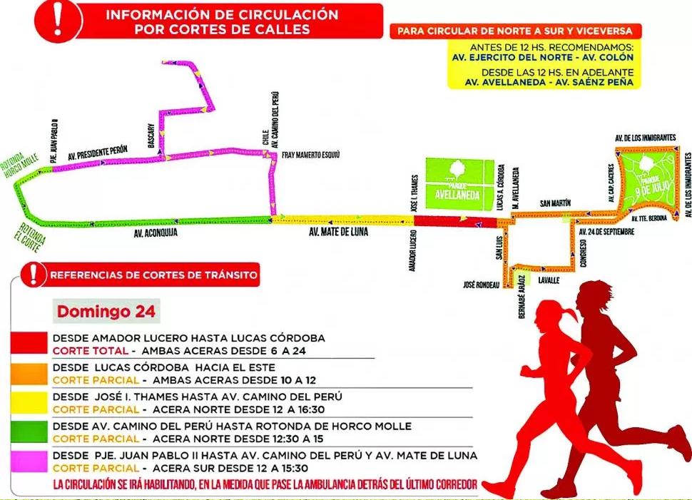 De 10 a 12, serán parciales por donde se desarrollarán los primeros kilómetros de la competencia de 42 kilómetros, hacia el este del cruce de avenida Mate de Luna y Lucas Córdoba y en la zona del parque 9 de Julio. Se inhabilitarán parcialmente la avenida Mate de Luna; las calles San Luis, Rondeau, Bernabé Aráoz, Lavalle, Congreso, 24 de Septiembre, Teniente Berdina (parque 9 de Julio), la avenida de los Inmigrantes, Capitán Cáceres (parque 9 de Julio), calle San Martín y Marco Avellaneda. De 12 a 16.30, se inhabilitará parcialmente la acera norte de la avenida Mate de Luna, desde José Thames hasta Camino del Perú. La circulación se irá habilitando a medida que pase la ambulancia detrás del último corredor.