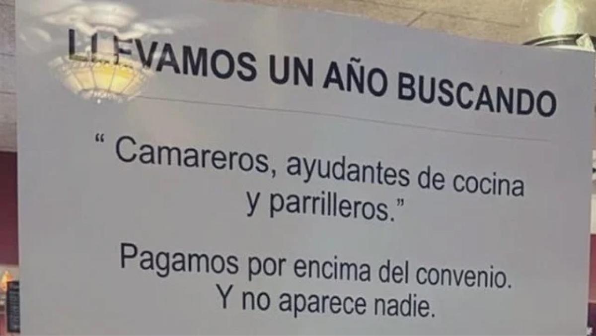 “Llevamos un año buscando”, dice el título del letrero en grande y luego especifica los puestos solicitados: camareros, ayudantes de cocina y parrilleros. Además mencionaron que, si bien pagan por encima del convenio, aún no apareció nadie.