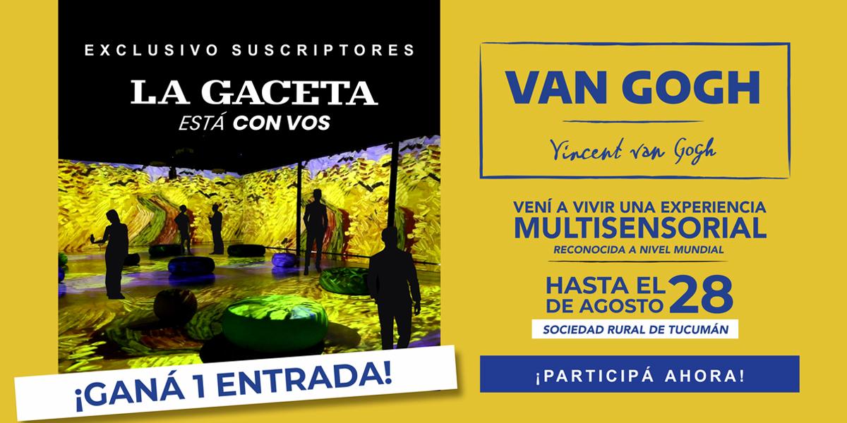 Seguimos pensando en nuestros suscriptores y en este caso queremos que disfrutes y vivas una experiencia única. En esta oportunidad sortearemos cinco entradas para el espectáculo “Van Gogh, experiencia de arte inmersiva”, el cual se exhibirá hasta el 28 de agosto en la Sociedad Rural de Tucumán de lunes a viernes de 10 a 12, y de 16 a 22, sábados y domingos con horario corrido, de 10 a 22.
