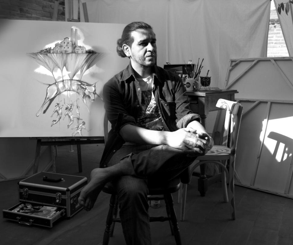 EL AUTOR Y SU OBRA. Mario Albarracín entrelaza en sus cuadros distintos elementos, como islas flotantes, el perro familiar o los obreros zafreros. gentileza mario albarracin