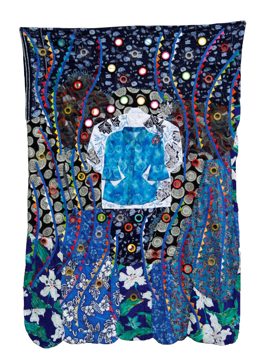 - Es un textil titulado “El abrazo”, que tiene dos metros por dos cincuenta, está todo bordado y tiene superposición de telas. Yo uso muchas veces ropa para los textiles, resignificando las vivencias que tienen esas prendas, que ya han sido usadas. Tiene espejos y varias técnicas que son propias de los artistas populares y que se conectan con el pensamiento que tienen estos artistas, que trabajan en silencio y conectados con la naturaleza. En la obra hablo de cómo el otro es tu espejo y el abrazo es más que lo físico. Es la sensación de que volvemos a nacer.
