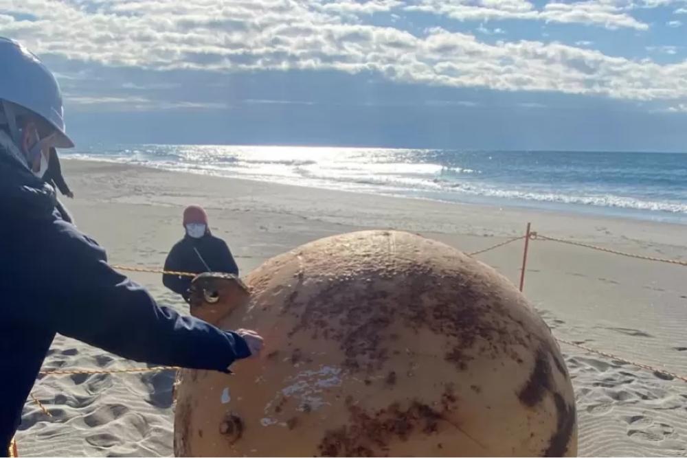 Luego de que la bola apareciera en la costa japonesa, funcionarios con cascos y trajes protectores contra materiales peligrosos acordonaron el área para estudiarla. Eso llevó a especular que podría ser una antigua mina transportada por mar o algún tipo de instrumento de espionaje.