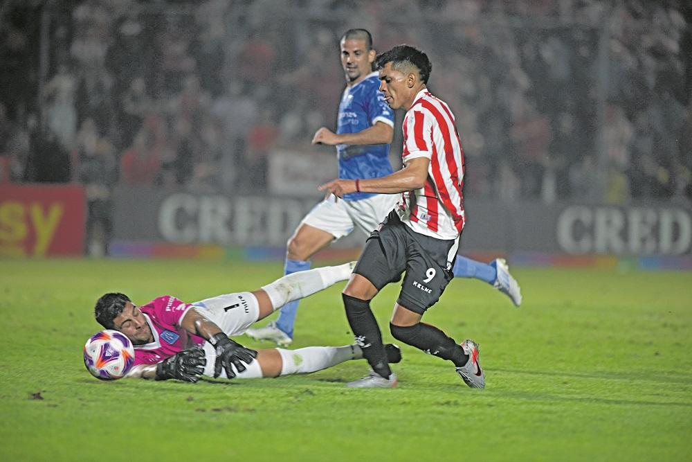 En la foto, Mauro Verón pierde con el arquero cordobés Petroli