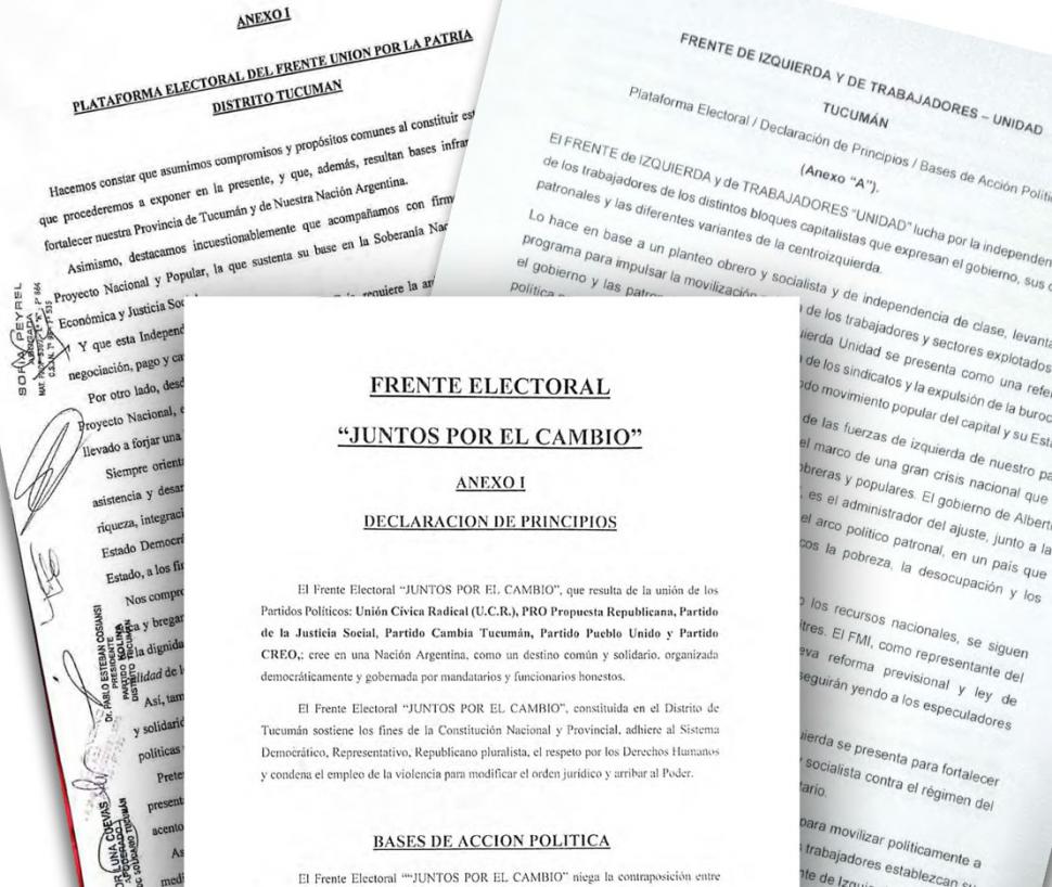 Hace 32 días, el 14 de junio, tres alianzas que competirán el 13 de agosto en las primarias abiertas en la provincia presentaron sus plataformas electorales, que no son otra cosa que la exposición del plan de acción política que ejecutarán en caso de acceder al poder. Es un requisito establecido en la ley nacional orgánica de partidos políticos (23.298), que establece que los partidos o frentes deben presentar ante el juez federal con competencia electoral la declaración de principios o bases de acción política conjunta (artículo 10 bis, inciso c).